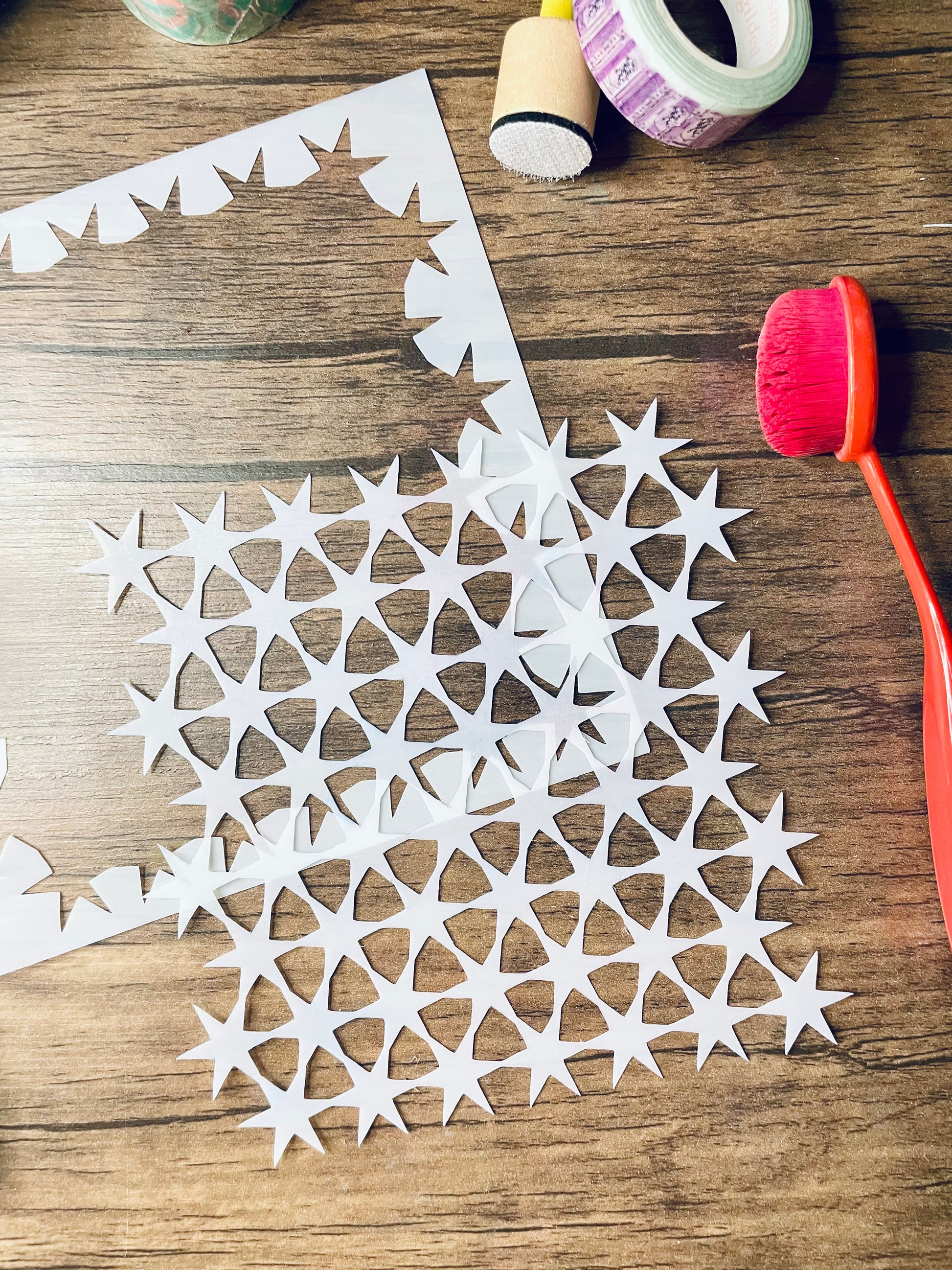 *Depending on ink/paint medium, stencils are washable, usually with water or soap and water. If you are using a medium which stains, please clean off with the appropriate cleaner as soon as possible!
