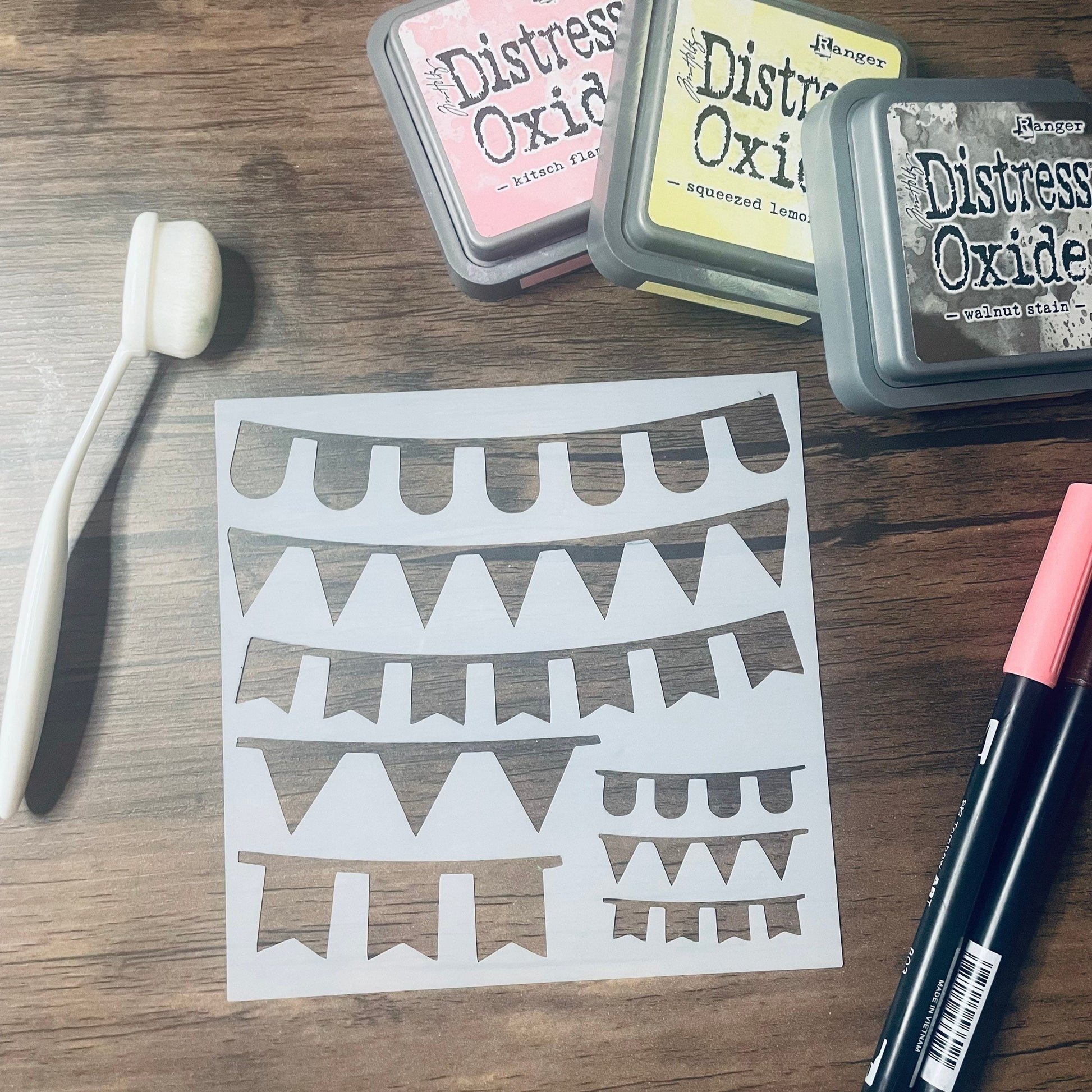 Add a little bit of unique flair to your planners, journals, Bujos, or scrapbooks with the Birthday Party Banners Stencil! Great for inking! Perfect for adding a unique touch to cards, journals, planners, scrabooks, art journals, and more!