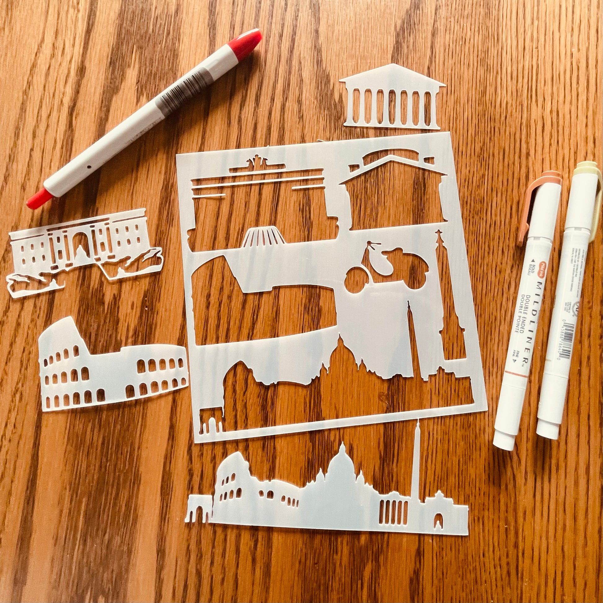 Add a little bit of unique flair to your planners, journals, Bujos, or scrapbooks with the Rome Monuments Stencil! Great for inking! Perfect for adding a unique touch to cards, journals, planners, scrabooks, art journals, and more!
